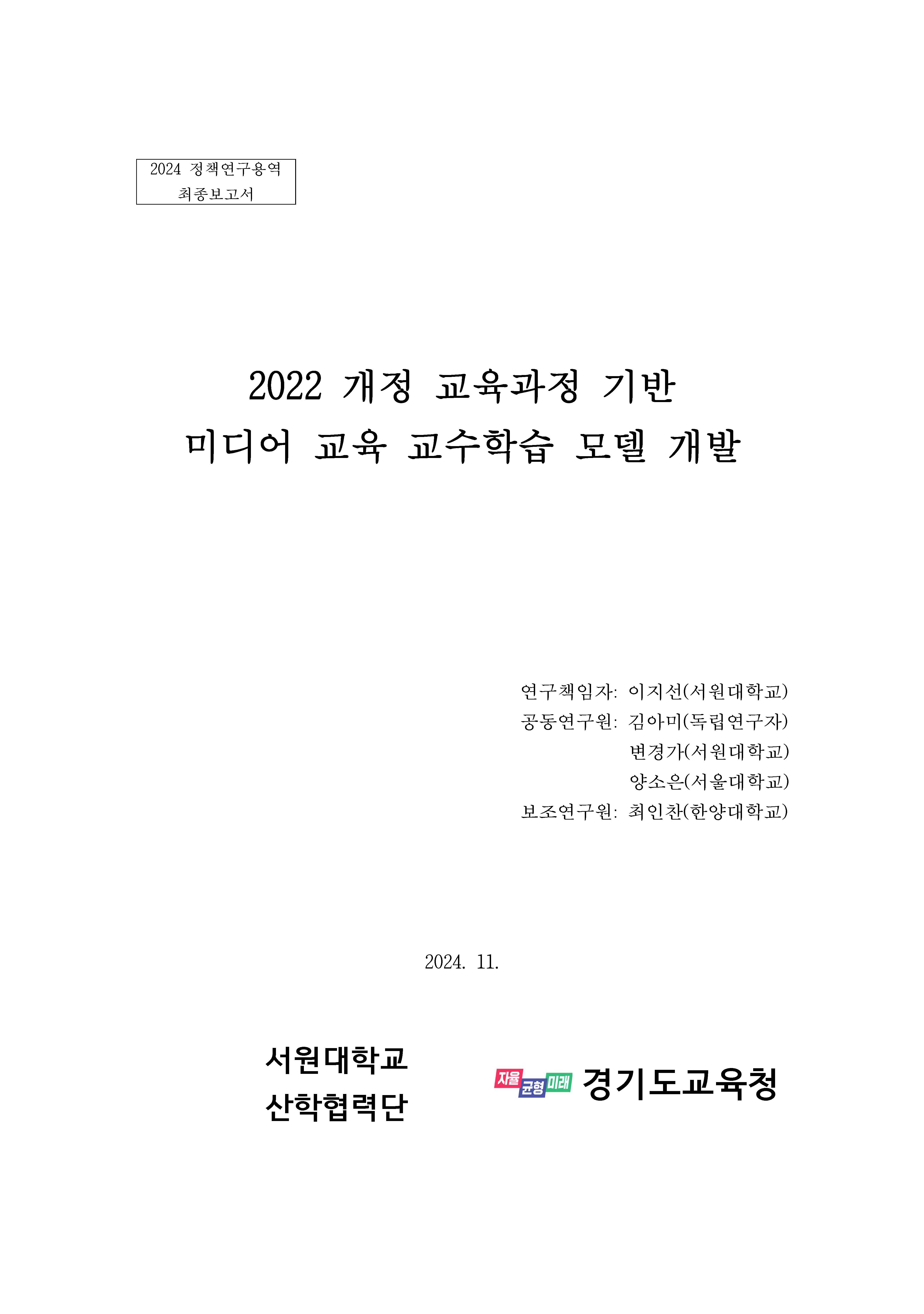 2022개정교육과정 기반 미디어교육 교수학습 모델 개발 (2024) 작성자 관리자 작성일 2025-10-15 조회수 18 저자 연구진 서원대학교 링크 URL 바로가기 발행처 경기도교육청 발행일 등록일 첨부파일 파일다운로드 2022개정교육과정 기반 미디어교육 교수학습 모델 개발.pdf (3.81 MB)